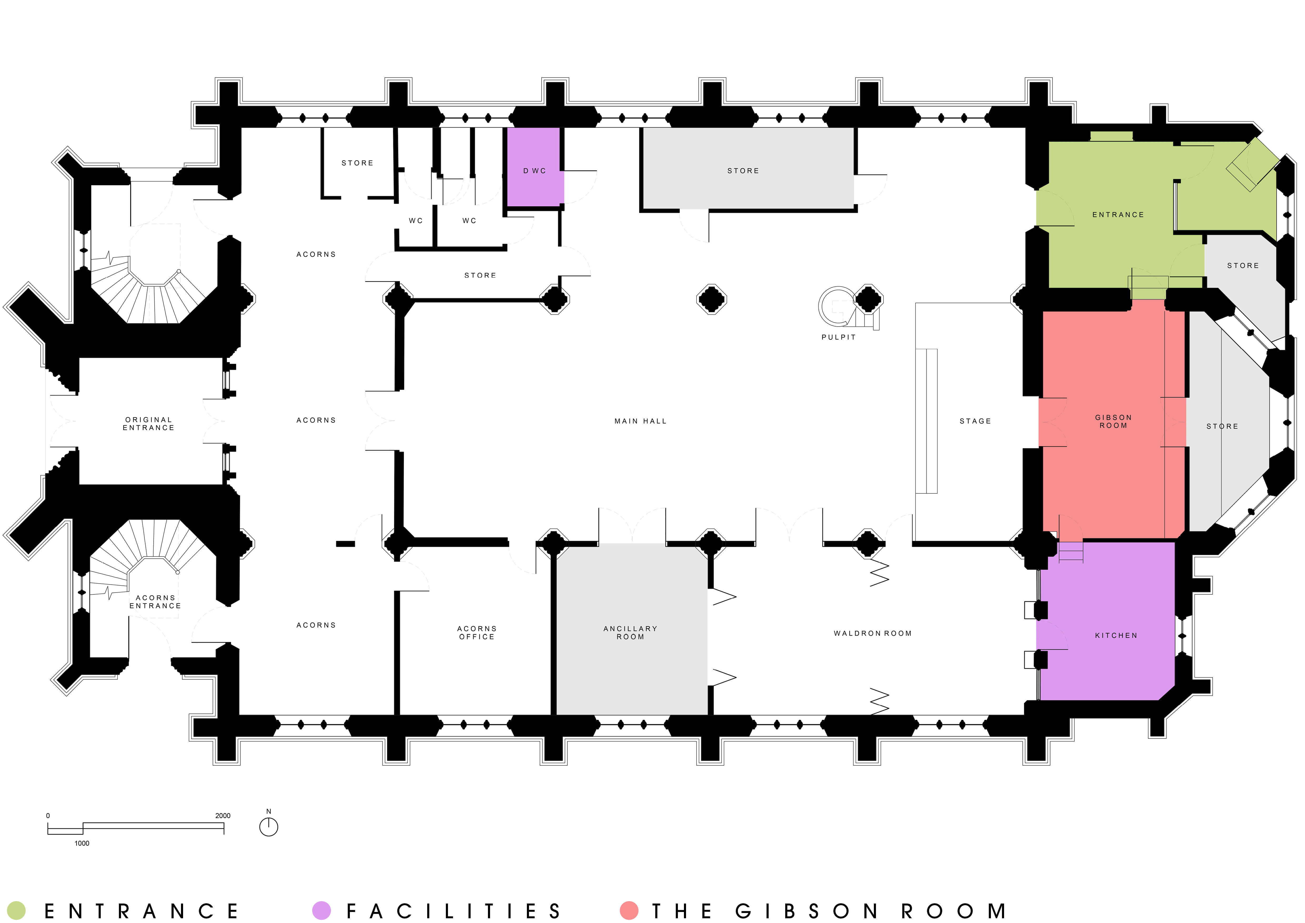 The Gibson Room measures 26 square metres (6.4 m x 4 m) it is accessed directly from the entrance hall and benefits from direct access to the kitchen and main hall. This space is regularly utilised by patrons for a range of meetings and craft activities and can be utilised in as a break-out room in conjunction with the main hall where required.